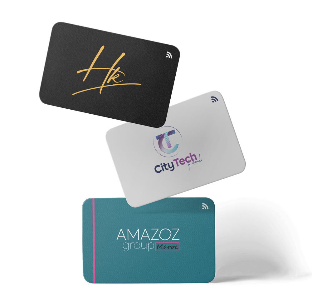 Une option accessible pour ceux qui souhaitent profiter de la technologie NFC au Maroc sans personnalisation. Cette carte NFC standard intègre notre design professionnel, et permet :