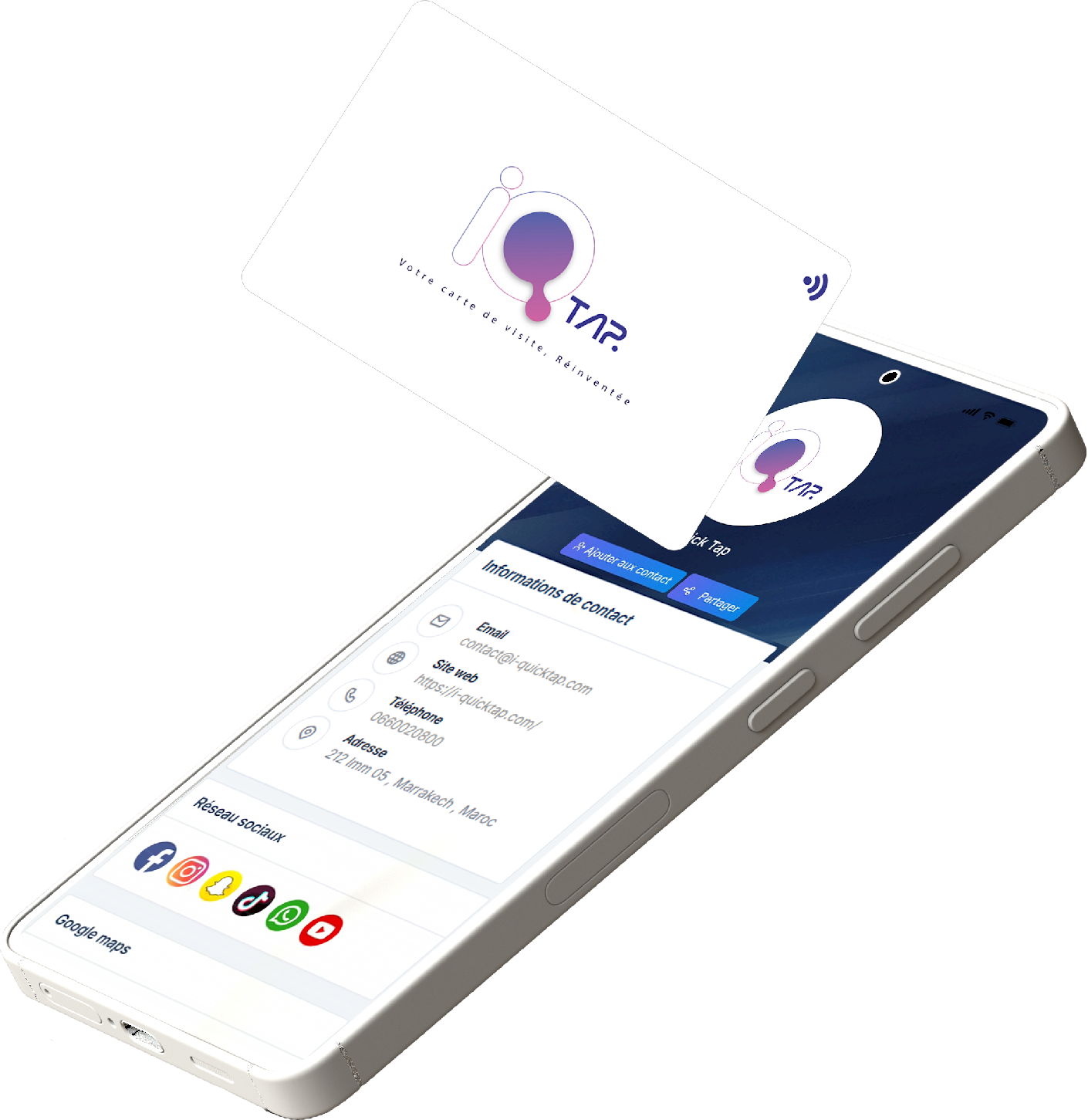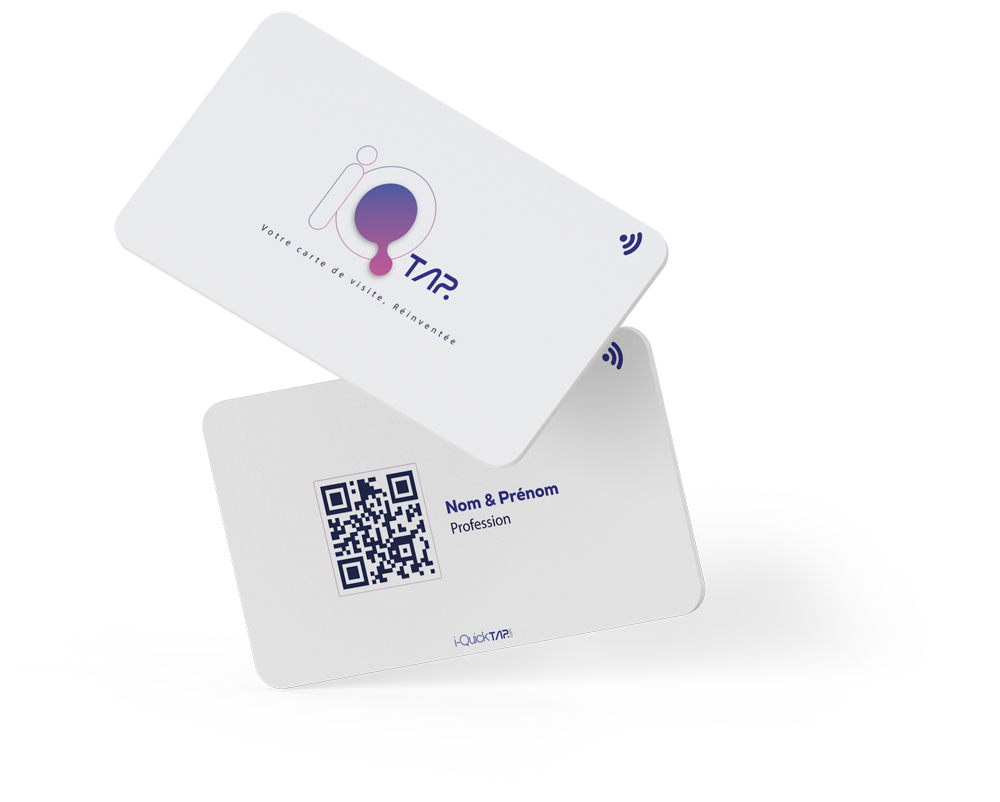Une carte NFC est une carte de visite connectée qui, grâce à une puce intégrée, permet de partager vos informations instantanément avec un smartphone compatible. Chez I Quick Tap, toutes nos cartes incluent aussi un QR Code pour fonctionner sur les téléphones qui n’ont pas le NFC.